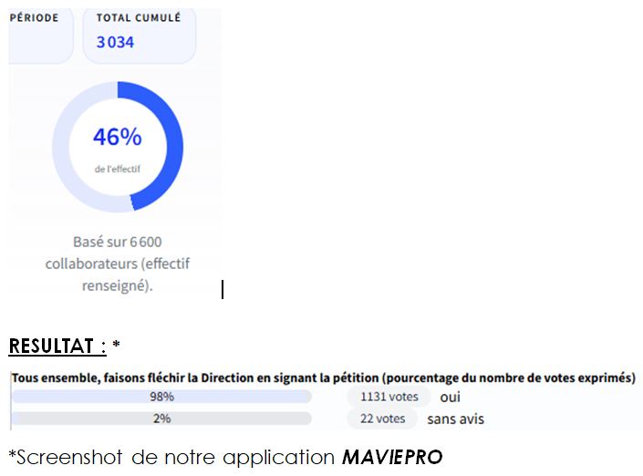 Face à cette décision, la CFTC a lancé une pétition interne par le biais de son application MAVIEPRO. Aujourd’hui, 37,28 % des effectifs utilisant l’Application ont signé (1153 votants dont 1131 POUR et 22 sans avis pour 3034 utilisateurs), un chiffre significatif qui démontre clairement que plus d’un salarié sur trois est en total désaccord avec cette décision. Ces chiffres ne peuvent être ignorés : ils traduisent une mobilisation réelle et un message clair : le statu quo n’est pas acceptable.