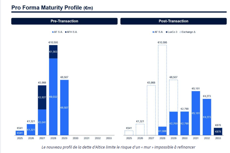 Comme nous le détaillons ci-dessous, Altice avait deux échéances – on pourrait même parler de « murs » – dans son viseur : 2027 et 2028 avec respectivement 5,9 et 10,6 milliards d’euros à rembourser. La maturité de la dette gagne trois ans avec cet accord